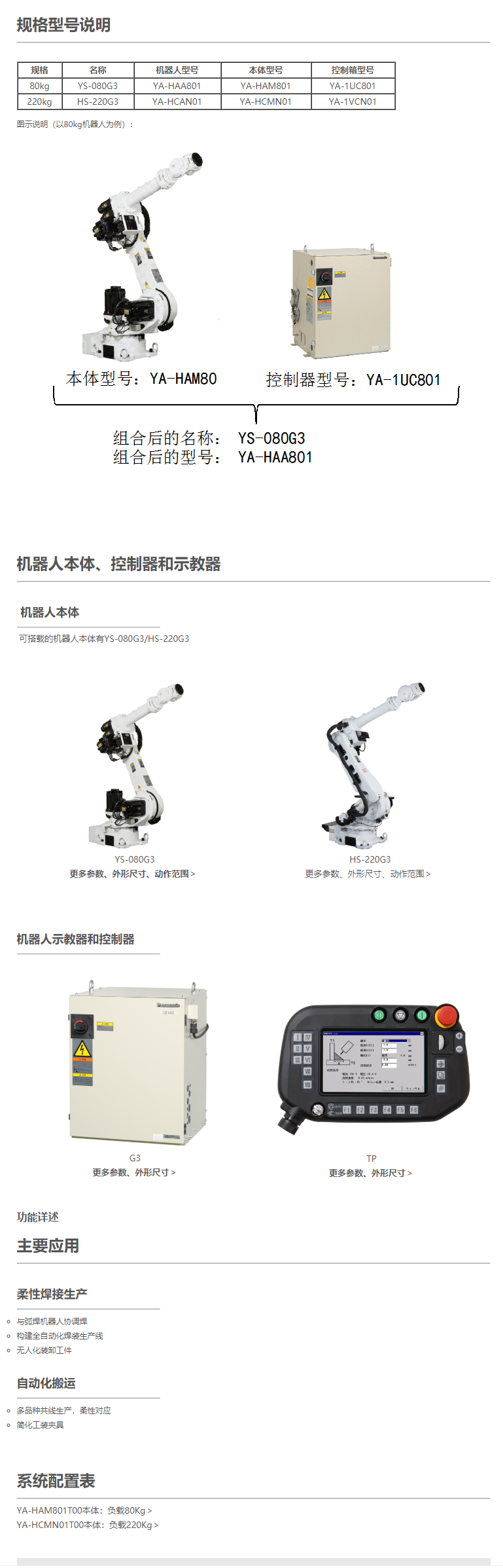 YS和HS系列機器人,是大型機器人,目前在售的產(chǎn)品具體名稱為YS-080G3機器人和HS-220G3機器人,其可搬重量分別為80kg和220kg,這2種機器人都使用G3控制器,一般用于搬運。